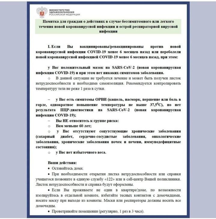 Минздрав России выпустил памятку для граждан о действиях в случае бессимптомного или легкого течения новой коронавирусной инфекции и острой респираторной вирусной инфекции